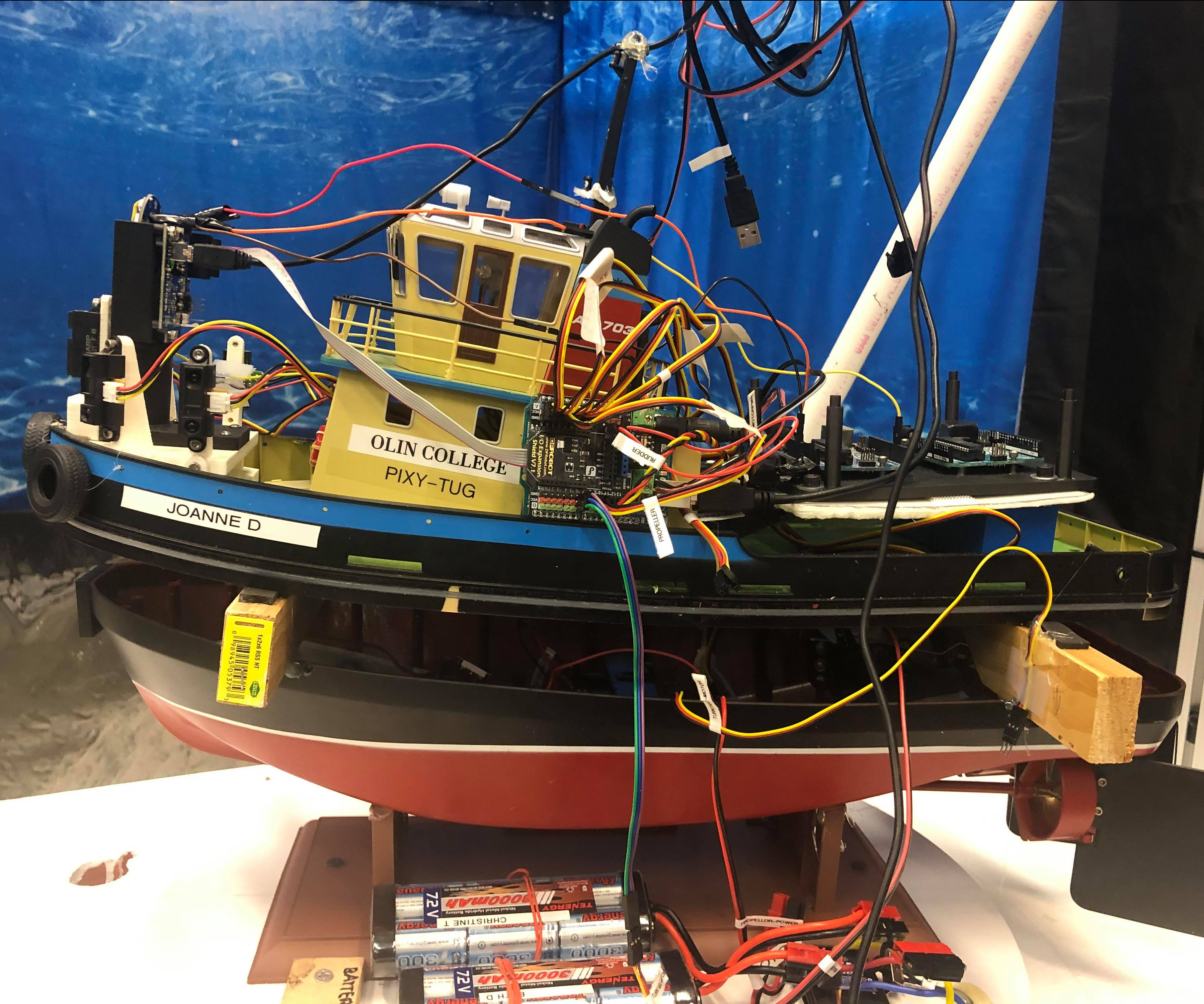 This project was for my Fundamentals of Robotics course. As a group we were tasked with making three overarching functions: Hunt, Follow and Avoid. Hunt's task was to make the boat rotate back and forth in place, scanning the entire area in front of it trying to find a pink narwhal stuffed animal. Follow does exactly that, it turns the boat so that it can follow the narwhal. Avoid's task was to keep the boat safe by detecting obstacles and guiding the boat around them. We also needed an Arbiter to pick which outputs to obey.