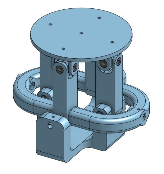 For this project I worked mainly on the CAD and fabrication of select mechanical aspects of the robot. All the final CAD was done in OnShape. I worked the most on the swashplate that acted as a hip joint allowing the robot to lean forwards/backwards and side to side. The pan and roll motors were each driven independently and the mechanisms were designed to not interfere with each other. This meant you could operate them both at the same time and have a wider range of motion.